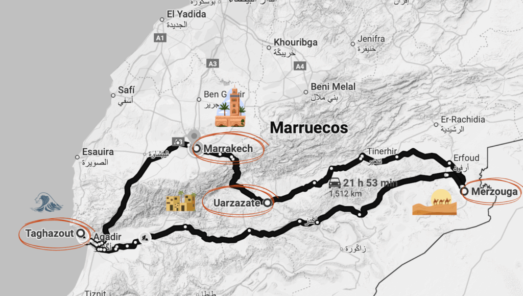 Marrakesh - Desierto del Sahara - Montañas del Atlas - Tagazout